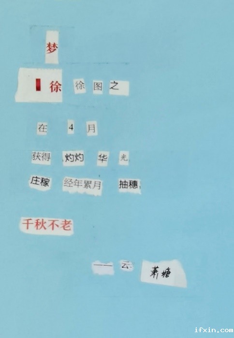 但传统诗歌的写作门槛将大多数普通人挡在门外,此时,拼贴诗将我们拥抱其中。拼贴诗,打破了纸张材质和文本形式的限制,把文字重新组合在一起,像一场化学反应,微妙而热烈。一张试卷,一本杂志,一份说明书,都可成为灵感迸发的土壤。学生们拿起剪刀,将废纸变为诗句,让创造的神思在字里行间奔涌。